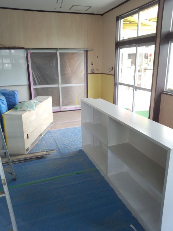 新しく作った棚の塗装。2回塗りで仕上げます。